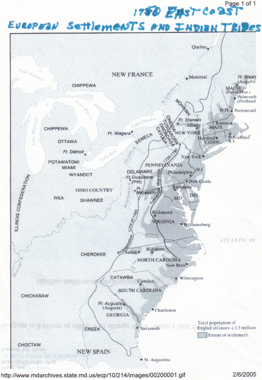 William Penn transferred the Delaware to the territory, bounding the western branches of the middle reaches of Monongahela River in 1696. This included Green County, Pennsylvania, parts of Washington and Fayette Counties, and nearby territory in what is now West Virginia. This would now be in Monongalia County, in the vicinity of Morgantown. This picture on the left depicts the proclamation line of 1763. All territory left of the line was still considered Indian Country. * On a side note. Guyasata led attacks against Fort Duquesne. |