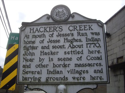 John Donelson's line, surveyed after the treaty of Lochaber with the Indians, 1770, crossed the road here. This line separated Indian territory from land open to settlement. Violations of the line by settlers contributed to Dunmore's War, 1774. As stated earlier Tecumseh had been born at Hackers Creek in 1768. one year before the first exploration of the valley by the whites. From The Border Settlers of Northwestern Virginia. The tradition that Tecumseh was born on Hacker's Creek, so briefly alluded to in a note supplied by me for the late edition of Chronicles of Border Warfare, is as follows: Sometime after the Treaty of Greenville, so the story goes, Tecumseh was in the settlements of the Upper Monongahela and visited Hacker's Creek. While there, in a conversation with a Miss Mitchel, Tecumseh declared that he was born on this creek; His first raid on white settlers was made on Hacker's Creek upon the family of John Waggoner in May, 1792. From the Chronicles of border warfare; or, a history of the settlement by the whites, of northwestern Virginia, and of the Indian wars, a group of Indians attacked the settlers on Hackers Creek and killed some and ran others off. |
