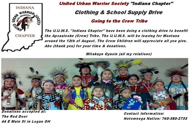 The United Urban Warrior Society, Indiana Chapter is collecting donations of clothing and school supplies for the Crow Tribe of Montana. Donations can be dropped off at The Red Door in Logan Ohio on 44 E Main Street. We will be accepting donations for the next couple of weeks. Thank you for any donations you can help with. The Crow Children will appreciate all.